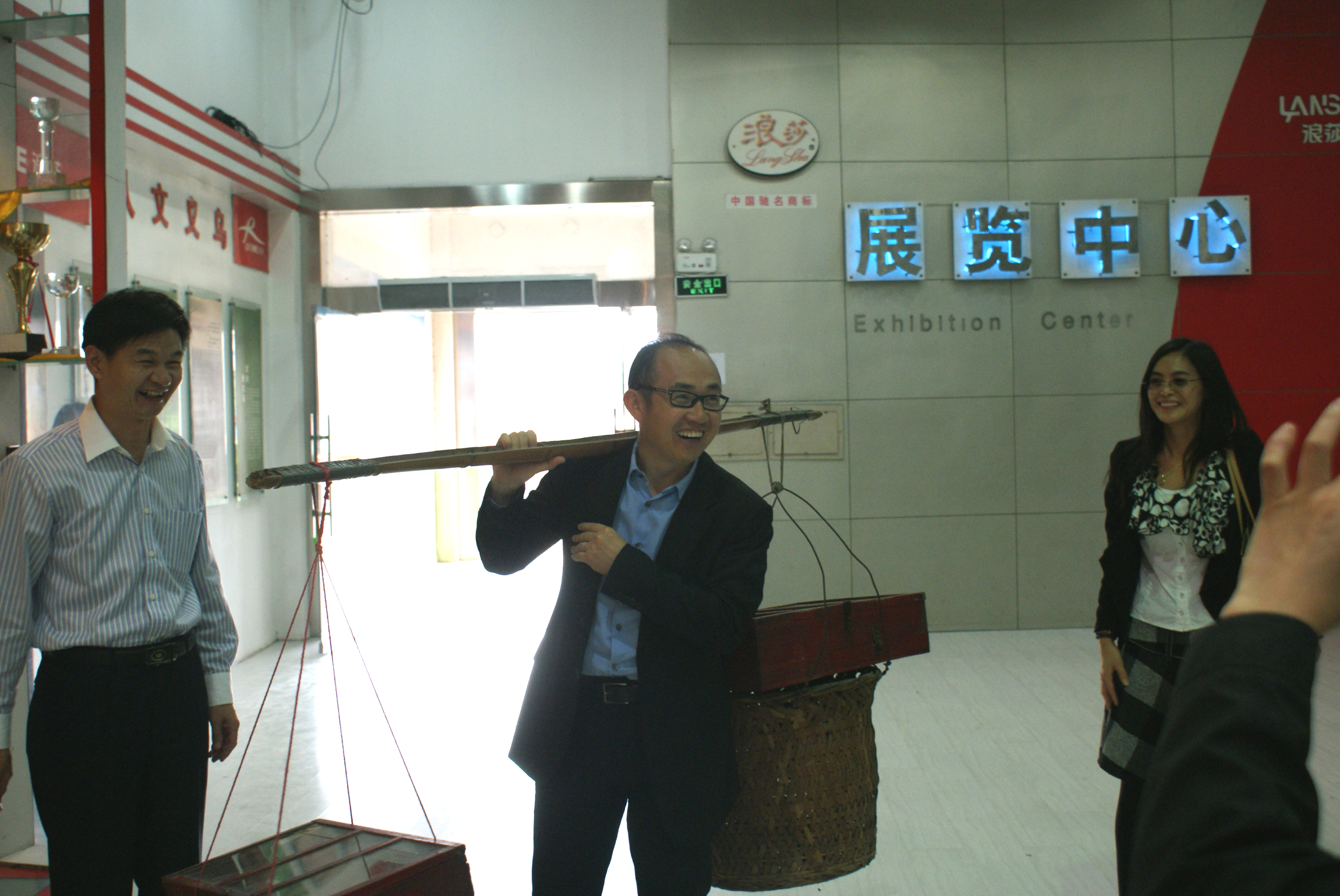 下午15點20分,潘董一行10余位企業家及工作人員來到浪莎二期。在浪莎展覽廳,潘董對其中陳列的一副貨郎擔很感興趣,于是饒有興味地試著把它挑起來。或許是比較陌生的緣故,貨郎擔不聽使喚,不過潘董倒不打算放棄。在試了幾次后,潘董找到了平衡點,把貨郎擔挑了起來。此刻,在場的工作人員都快樂地笑了起來。