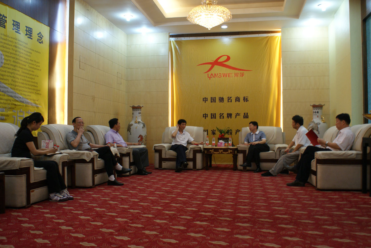 隨后,董事長與各位領導進行了座談,主要就區域之間發展模式、條件、優勢等進行了交流探討,具體如地區人力資源、地方政策等問題。其中,有領導問到了公司技術研發隊伍的情況,董事長翁榮金表示公司一直在引進具有高專業素質的大學生人才來充實這支隊伍,不斷加強研發能力。另外,朱紹平等領導還對公司的發展目標特別感興趣,圍繞著“做世界襪王”這一話題,大家了發表了各自的看法,表示中國是世界最大的襪子生產基地,具有精湛的技術、國際化的設備、豐富的勞動力,現在就缺少一個國際化的襪業品牌,而浪莎有實力有毅力去打造,如今浪莎已在全球20多個國家有自主品牌的代理,主要集中在歐洲、北美、南美,領導們對浪莎實現“做世界襪王”這一目標非常有信心。