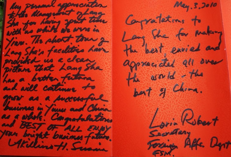 浪莎集團領導和義烏市領導熱情地接待了莫里總統,并陪同莫里總統參觀了浪莎廠區及產品。在“浪莎”的產品展示區,莫里認真了解了我市市場演變的歷史過程和“浪莎”的發展蛻變,竹纖維產品、莫代爾纖維產品、大豆產品、亞麻產品等高科技襪讓莫里總統贊不絕口。尤其對浪莎毛巾非常感興趣,隨即拿起一條條各色款式的毛巾仔細翻看,他說,這些毛巾質地十分柔軟舒適,外觀也十分漂亮,價廉物美,讓他“一見傾心”。當時就預訂了大量毛巾和T恤。臨別時,莫里總統還在浪莎“嘉賓提名薄”上寫道,他及他的代表團非常感謝浪莎的熱情款待,帶他們參觀浪莎產品。我們希望在不久的將來到你這里買更多的好產品。非常歡迎并希望浪莎人到密克羅尼西亞回訪他。