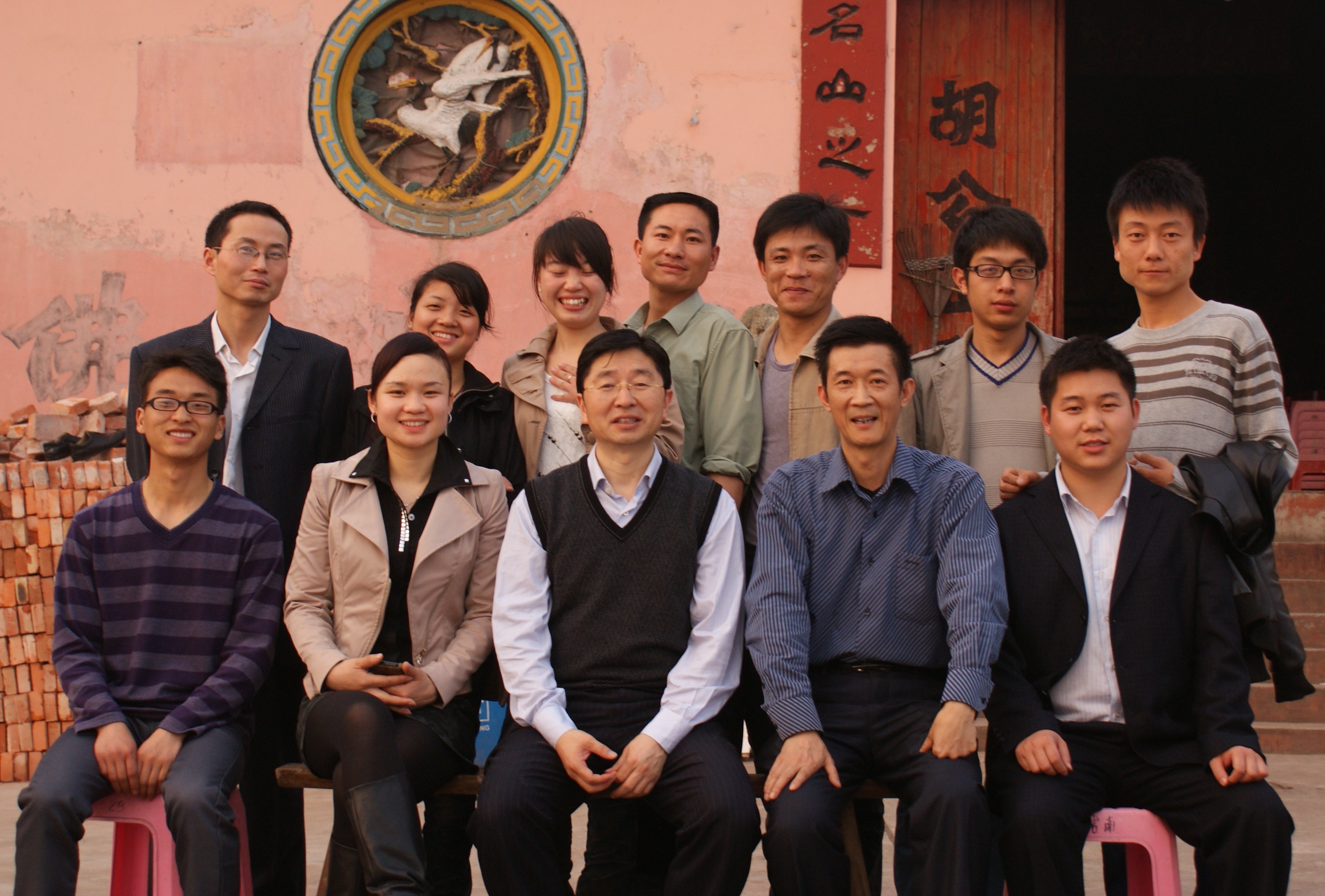 董事長(zhǎng)與大家在山腳下農(nóng)家屋前合影