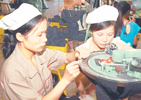 昨日,浪莎控股集團對目車間的邵紫紅(左)、邵紫敏(右)姐妹倆正在縫制襪口。今年28歲的邵紫紅和25歲的邵紫敏是江西廣豐人,2002年雙雙被招入浪莎控股集團對目車間。進廠后,姐妹倆刻苦學習,努力工作,練就了過硬的襪子縫口技術,每人日均縫制襪口800雙,相當于2.5個工人的生產量,而且質量全部達標。如今,姐妹倆人均月收入超過4000元,成了浪莎集團的生產標兵。