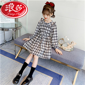 - 浪莎韓版女童花邊翻領黑白格子連衣裙2021春裝新款兒童長袖公主裙